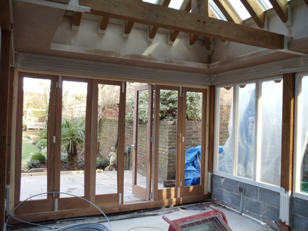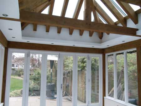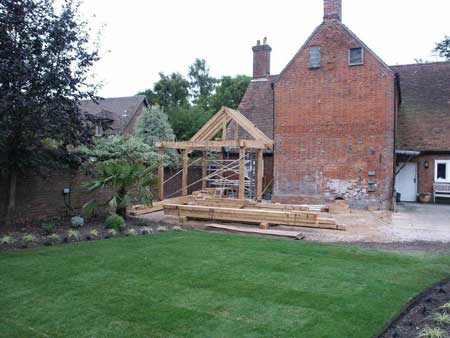 SPECIFICATION: Orangery built with green oak onto a Grade II listed building. All works carried out including our interior design service.